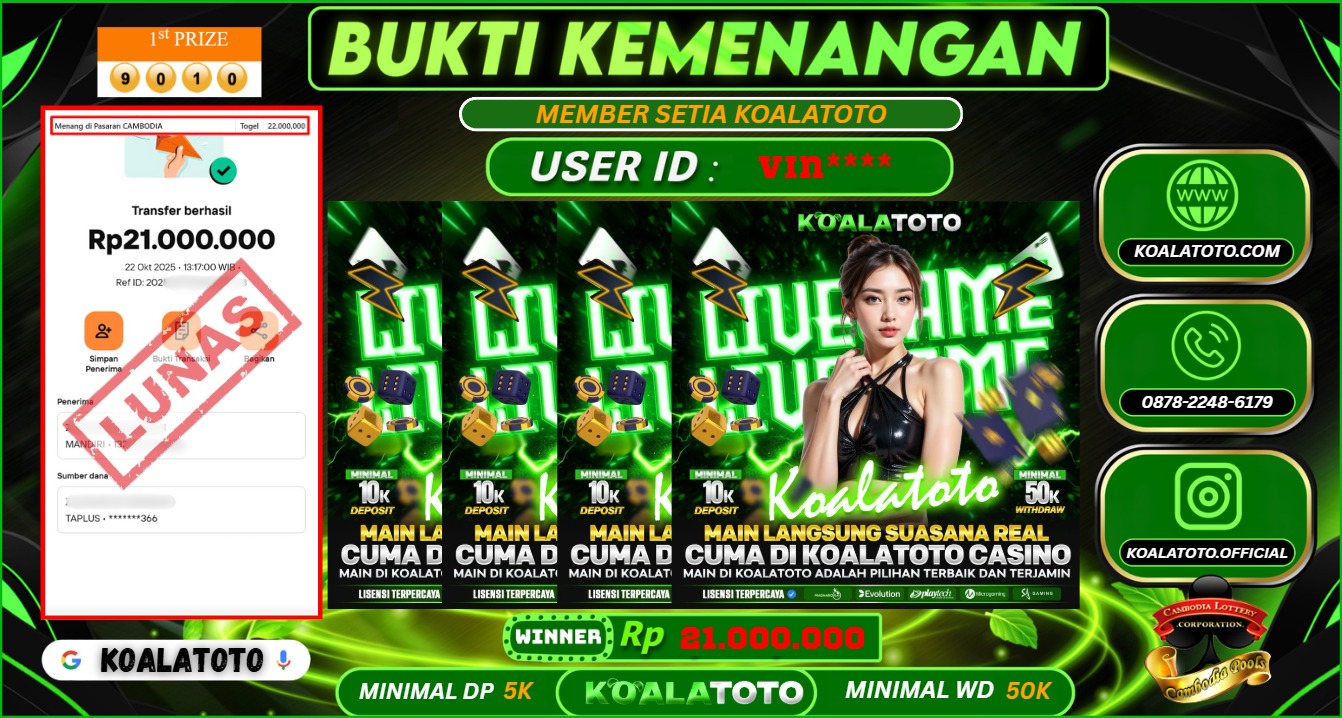 KOALATOTO JACKPOT TOGEL CAMBODIA POOLS || Rp.21.000.000.,- DI BAYAR LUNAS !!!