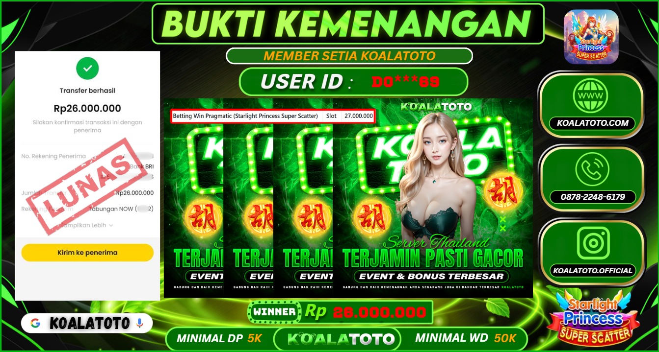 Selamat kepada USER ID : DO****69 || Telah berhasil mendapatkan kemenangan pada Game SLOT Starlight Princess Super Scatter Pihak KOALATOTO Mengucapkan Terima Kasih Kepada Pemenang karena Sudah Mempercayakan KOALATOTO sebagai Platform Situs Bandar Togel Online dan Slot Online Terpercaya & Terbesar yang Membayar Kemenangan Member berapapun itu tanpa ribet sampai LUNAS !!! Setelah mengisi FORMULIR WITHDRAW pihak KOALATOTO membutuhkan waktu sekitar 1-3 MENIT Untuk memproseskan Kemenangan Kalian Kami menegaskan bahwa KOALATOTO bukanlah Bandar Kaleng-Kaleng. Kami meyakinkan bahwa semua kemenangan akan dibayarkan Bergabunglah dengan KOALATOTO sekarang dan dapatkan kesempatan memenangkan Jackpot besar hanya di KOALATOTO !!!