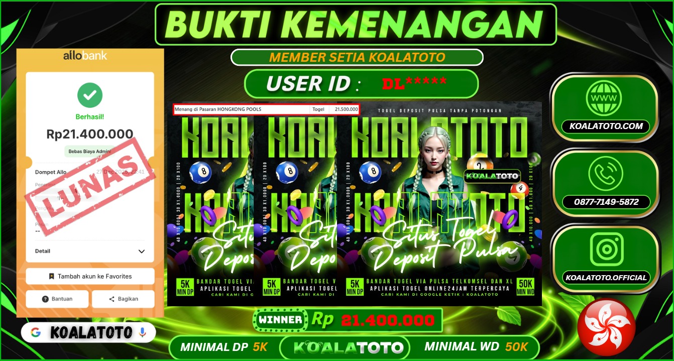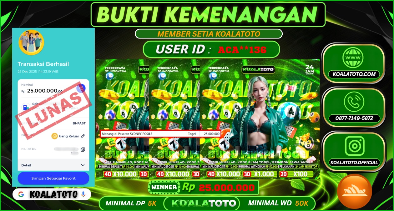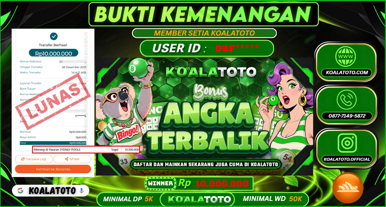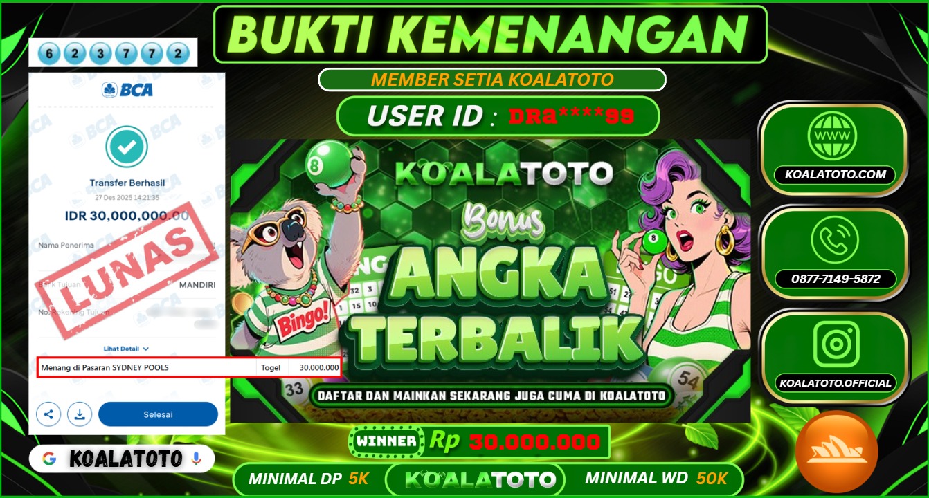 Selamat kepada USER ID : ALH**** || Telah berhasil mendapatkan kemenangan pada Pasaran TOGEL SYDNEY POOLS Pihak KOALATOTO Mengucapkan Terima Kasih Kepada Pemenang karena Sudah Mempercayakan KOALATOTO sebagai Platform Situs Bandar Togel Online dan Slot Online Terpercaya & Terbesar yang Membayar Kemenangan Member berapapun itu tanpa ribet sampai LUNAS !!! Setelah mengisi FORMULIR WITHDRAW pihak KOALATOTO membutuhkan waktu sekitar 1-3 MENIT Untuk memproseskan Kemenangan Kalian Kami menegaskan bahwa KOALATOTO bukanlah Bandar Kaleng-Kaleng. Kami meyakinkan bahwa semua kemenangan akan dibayarkan Bergabunglah dengan KOALATOTO sekarang dan dapatkan kesempatan memenangkan Jackpot besar hanya di KOALATOTO !!!