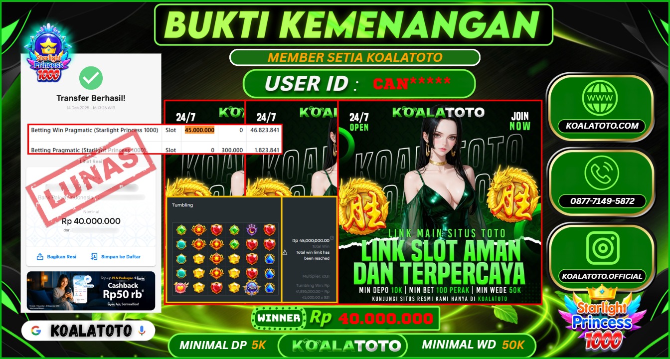 Selamat kepada USER ID : CAN*** || Telah berhasil mendapatkan kemenangan pada Game SLOT STARLIGHT PRINCESS 1000 Pihak KOALATOTO Mengucapkan Terima Kasih Kepada Pemenang karena Sudah Mempercayakan KOALATOTO sebagai Platform Situs Bandar Togel Online dan Slot Online Terpercaya & Terbesar yang Membayar Kemenangan Member berapapun itu tanpa ribet sampai LUNAS !!! Setelah mengisi FORMULIR WITHDRAW pihak KOALATOTO membutuhkan waktu sekitar 1-3 MENIT Untuk memproseskan Kemenangan Kalian Kami menegaskan bahwa KOALATOTO bukanlah Bandar Kaleng-Kaleng. Kami meyakinkan bahwa semua kemenangan akan dibayarkan Bergabunglah dengan KOALATOTO sekarang dan dapatkan kesempatan memenangkan Jackpot besar hanya di KOALATOTO !!!